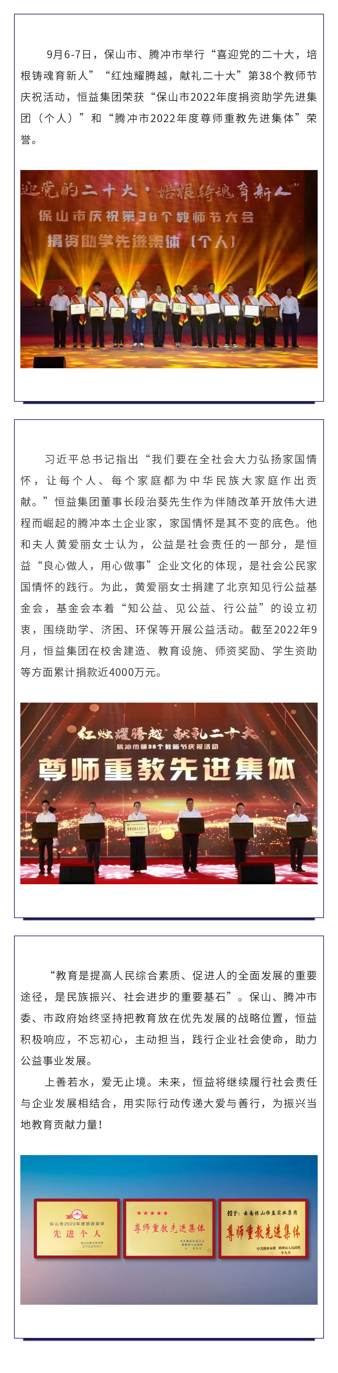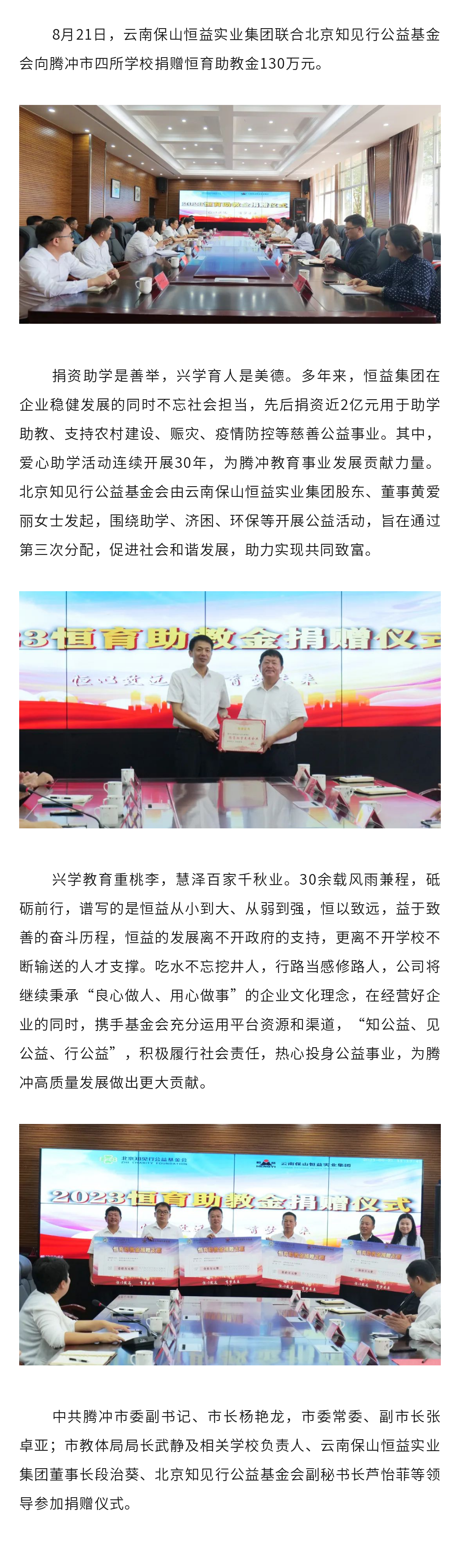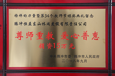 2018年9月10日,榜樣的力量暨第34個教師節,恒益集團向中共騰沖市委市政府捐資15萬元;