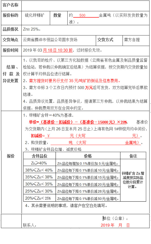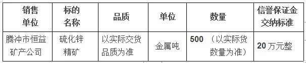騰沖市恒益公司關于鋅精礦競價銷售公告(201901)號