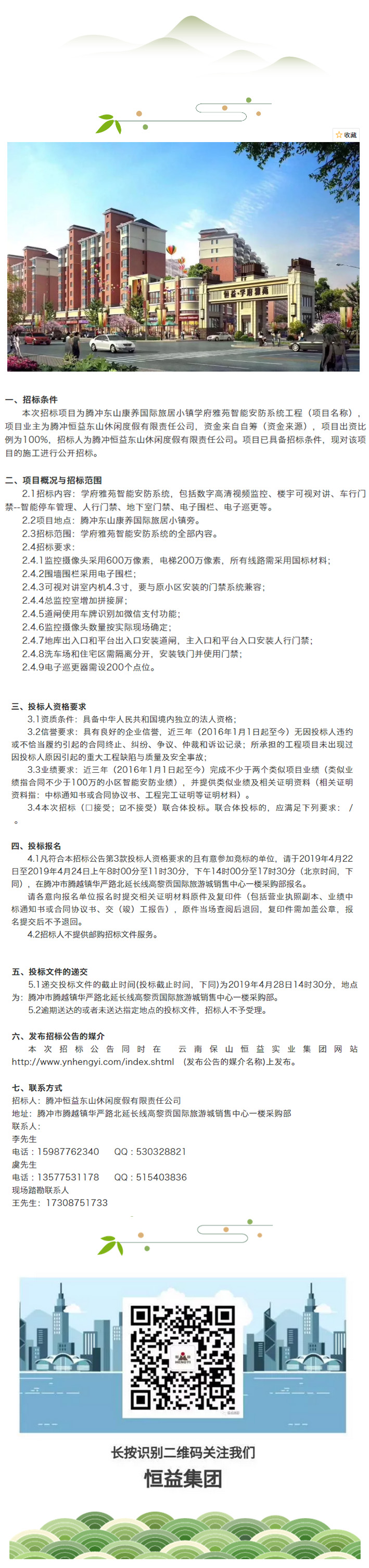 騰沖東山康養(yǎng)國際旅居小鎮(zhèn)學(xué)府雅苑智能安防系統(tǒng)工程施工招標(biāo)公告 來源: 瀏覽量:11365 日期:2019-04-22 分享到: 上一篇:騰沖市恒益礦產(chǎn)品經(jīng)貿(mào)公司關(guān)于鋅精礦競(jìng)價(jià)銷售公告(201903)號(hào) 下一篇:騰沖恒益東山農(nóng)業(yè)開發(fā)有限公司牛只采購競(jìng)價(jià)招標(biāo)公告