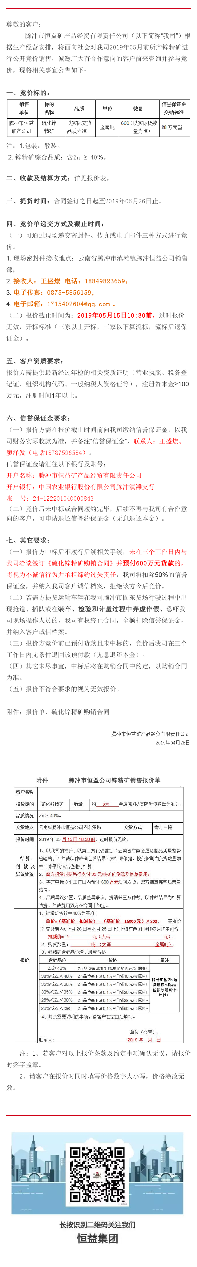 騰沖市恒益礦產品經貿公司關于鋅精礦競價銷售公告(201903)號 來源: 瀏覽量:11101 日期:2019-04-28 分享到: 上一篇:騰沖市恒益礦產品經貿公司關于鋅精礦競價銷售公告(201904)號 下一篇:騰沖東山康養國際旅居小鎮學府雅苑智能安防系統工程施工招標公告