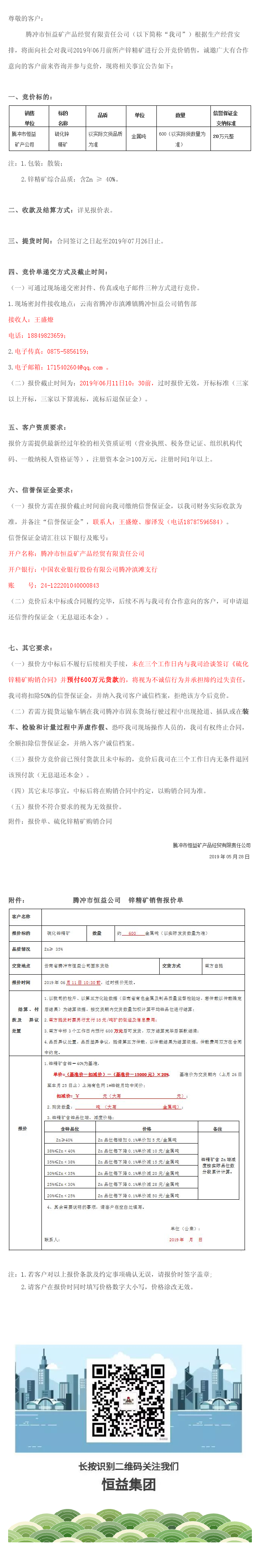 騰沖市恒益礦產品經貿公司關于鋅精礦競價銷售公告(201904)號 來源: 瀏覽量:10500 日期:2019-05-28 分享到: 上一篇:高黎貢國際健康旅居小鎮低層住宅八組團-江山小院精裝樣板房裝修施工工程招標公告 下一篇:騰沖市恒益礦產品經貿公司關于鋅精礦競價銷售公告(201903)號