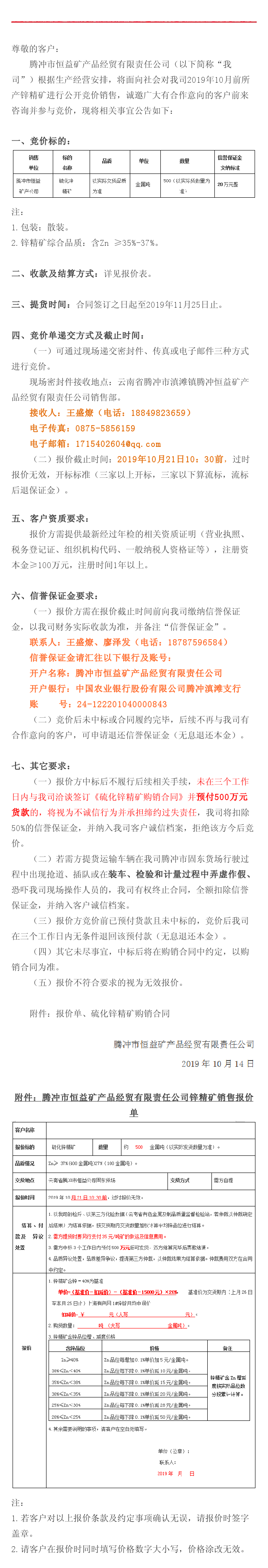 騰沖市恒益礦產(chǎn)品經(jīng)貿(mào)有限責(zé)任公司關(guān)于鋅精礦競(jìng)價(jià)銷售公告(201905)號(hào)