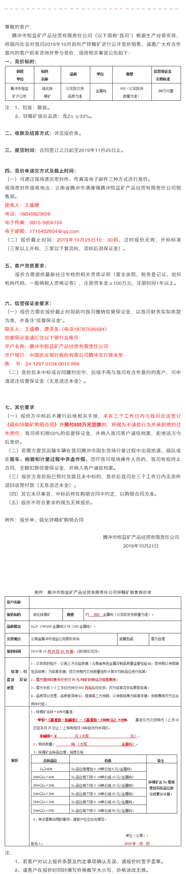 騰沖市恒益礦產品經貿有限責任公司關于鋅精礦競價銷售公告(201910)號