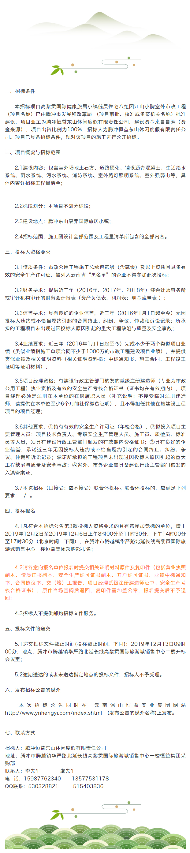 高黎貢國際健康旅居小鎮低層住宅八組團江山小院室外市政工程施工招標公告 來源: 瀏覽量:11374 日期:2019-12-02 分享到: 上一篇:高黎貢國際健康旅居小鎮低層住宅八組團——景秀東山A區建筑消防工程施工招標公告 下一篇:騰沖市恒益礦產品經貿有限責任公司關于鋅精礦競價銷售公告(201911)號