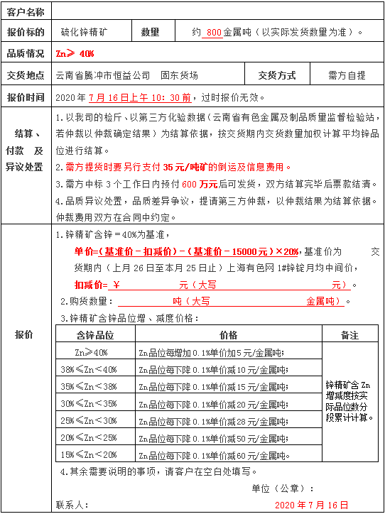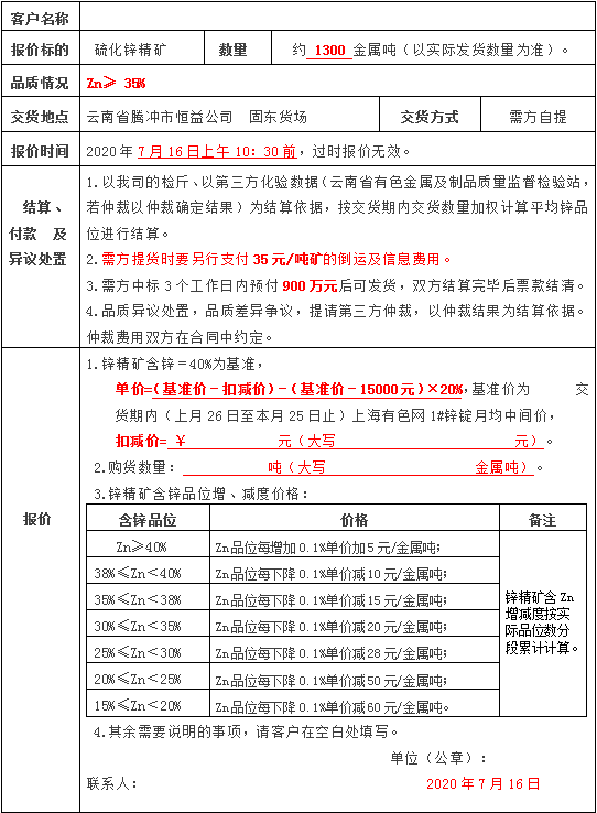 附件:騰沖市恒益礦產品經貿有限責任公司鋅精礦銷售報價單