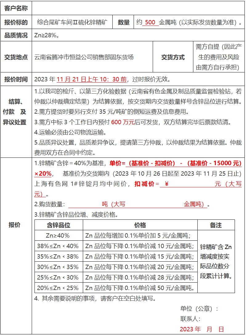 附件:騰沖市恒益礦產品經貿有限責任公司鋅精礦銷售報價單