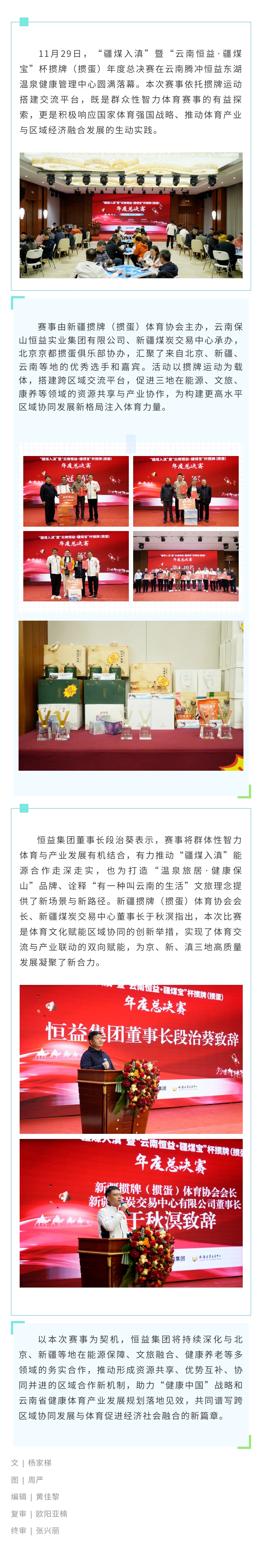 “云南恒益·疆煤寶”杯摜牌(摜蛋)年度總決賽圓滿落幕,以健康體育為媒推動區(qū)域協(xié)同與產(chǎn)業(yè)融合 來源: 瀏覽量:1422 日期:2025-11-30 分享到: 上一篇:2025騰沖科學家論壇·旅居與醫(yī)康養(yǎng)創(chuàng)新發(fā)展論壇盛大啟幕 下一篇:恒益集團攜手中輕國際 共筑康養(yǎng)產(chǎn)業(yè)合作新篇章