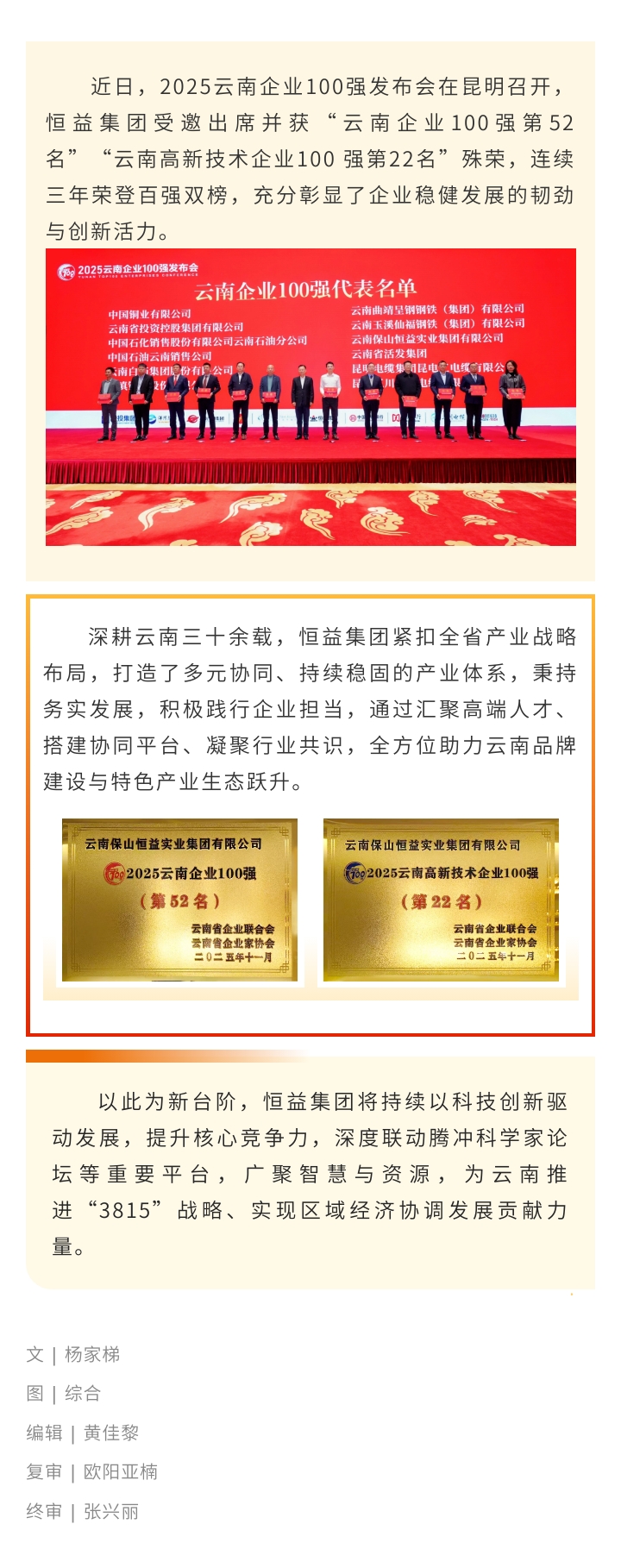 喜訊!恒益集團連續三年榮登云南企業百強雙榜